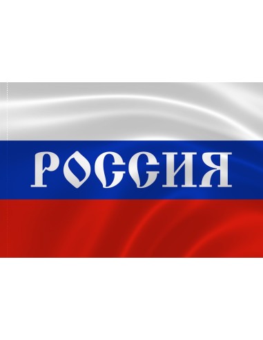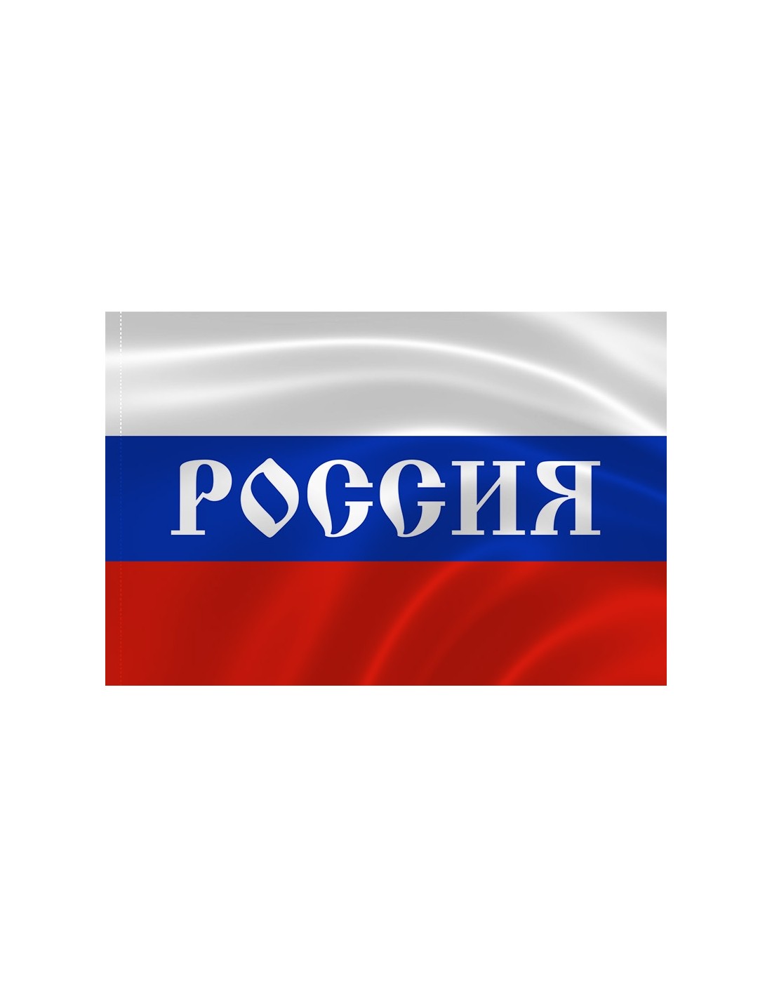 Классический флаг России (триколор) с надписью "Россия" белого цвета.