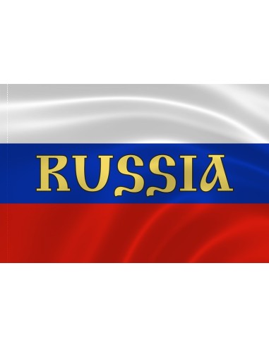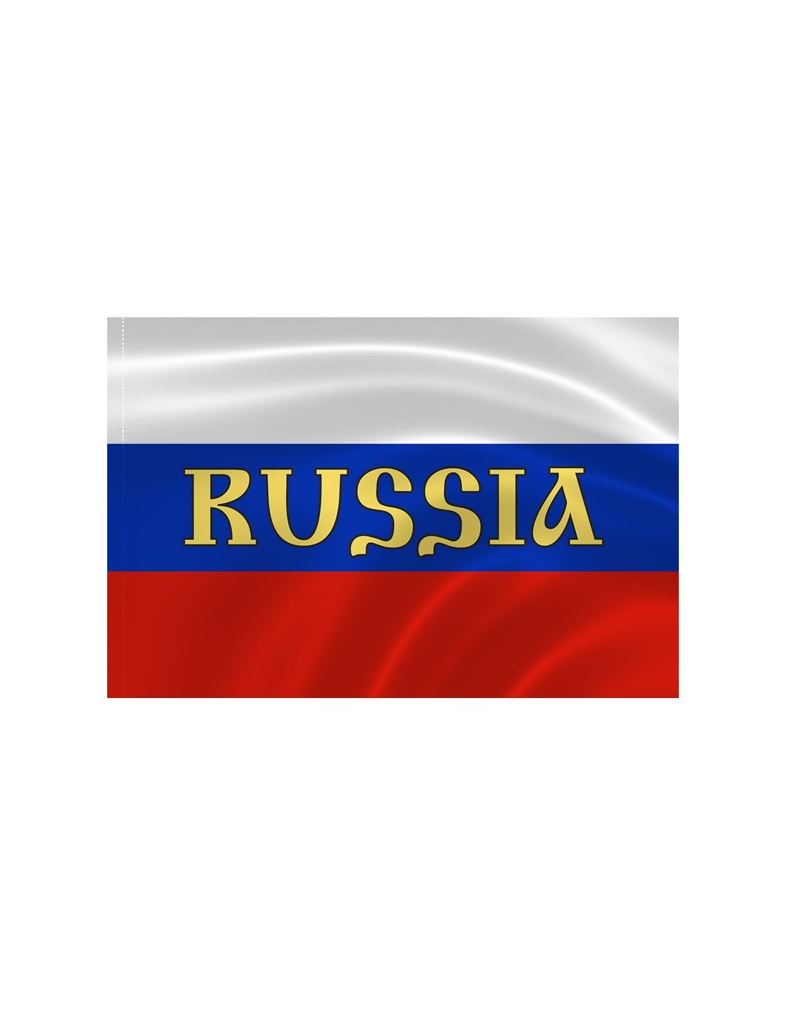 Классический флаг России (триколор) с надписью "Russia" золотистого цвета.