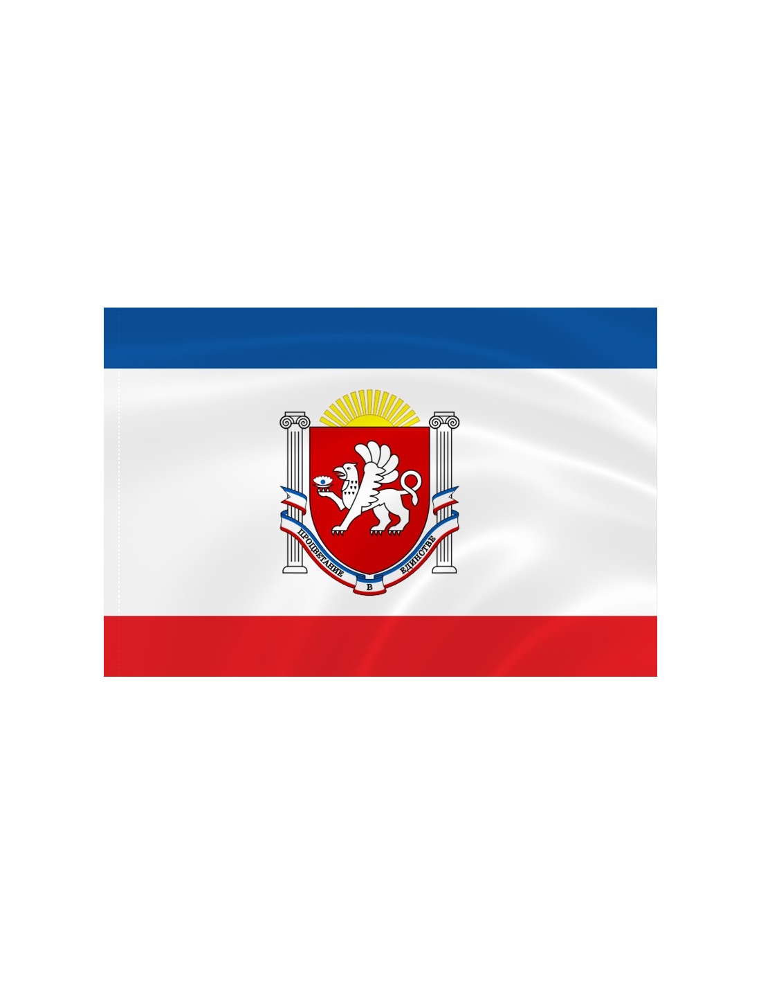 На щите красного цвета изображен серебряный грифон, обращенный влево и держащий в лапе раскрытую серебряную раковину с голубой жемчужиной. Восходящее солнце венчает композицию, а белоснежные колонны расположены по бокам герба. Лента традиционных крымских цветов, на которой написано «Процветание в единстве» соединяет колонны между собой.