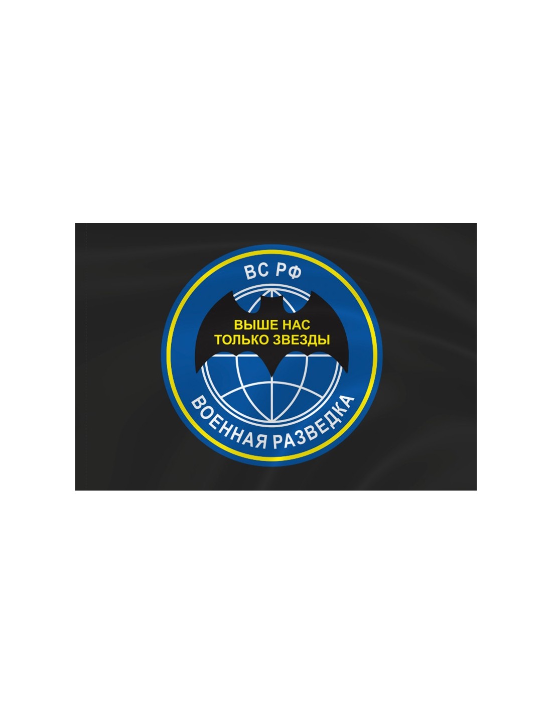 Неофициальный символ военной разведки – летучая мышь на хорошо узнаваемой эмблеме. Девиз «выше нас только звезды» отражает суть разведки, подчеркивает значимость российских разведывательных подразделений. Такой флаг станет желанным подарком всем, кто служил и служит в ГРУ и прочих частях военной разведки РФ